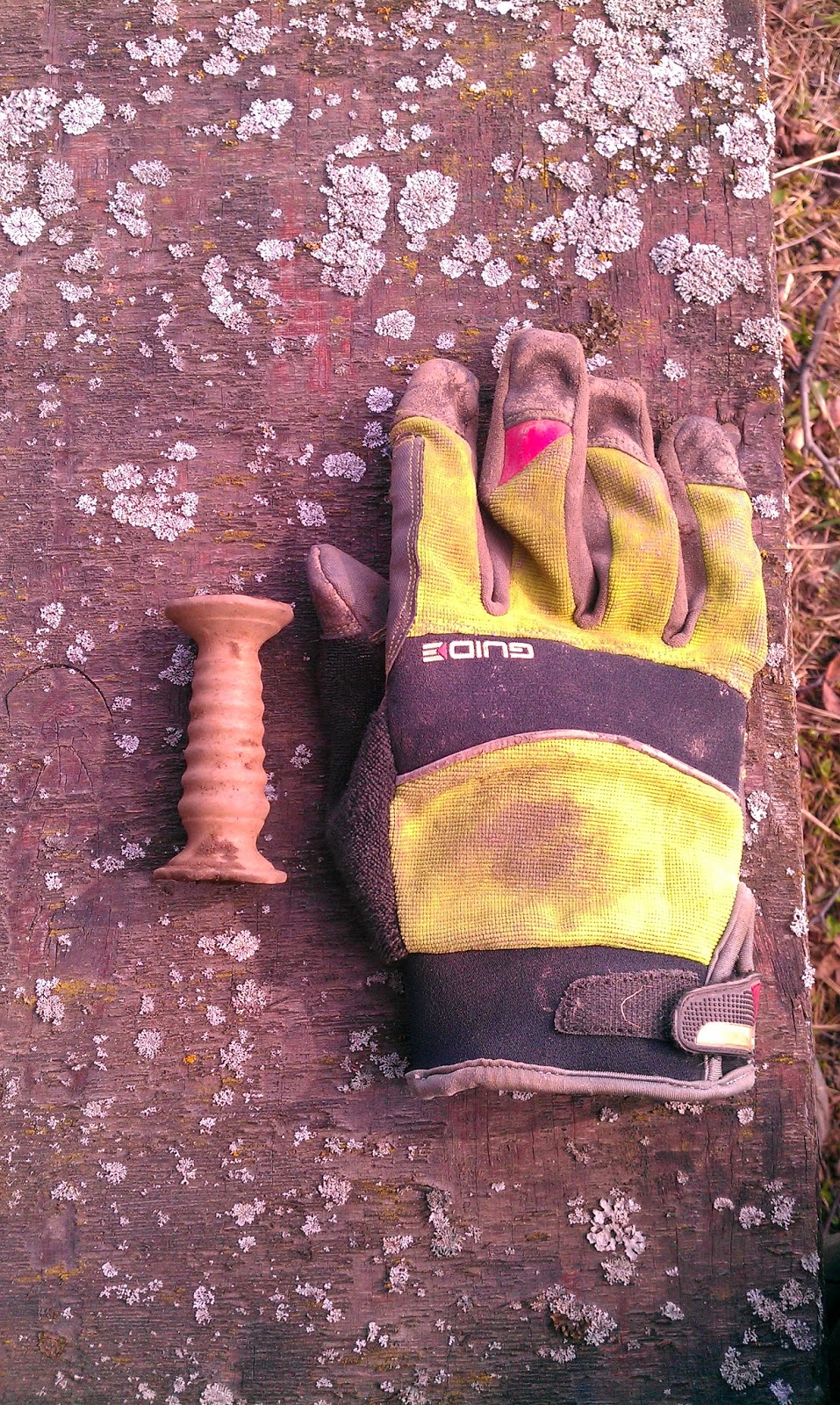 Ja kun puukolla ja kiskomalla oli söheltänyt pressukuiduista läpi ja saanut sen ruokalusikallisen maata ylös, tuli UUSI KERROS MUOVIA. Kuopan laajentamine suuntaan jos toiseen ei auttanut, melkein joka paikassa tuli loputon muovikerros vastaan. Onneksi siunattu isäntä otti traktorin ja kauhan ja puski maata että päästäisiin kunnon kerroksiin käsiksi. Ele säästi tuhannen työtuntia: